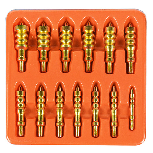 Pachet de 13 bucăți pentru curățarea pistoalelor din alamă set, pachet blister, dimensiuni: .177, .22, 6mm, .25, .27, .30, .338, .35, .357, .40, .44, .45, .50cal.