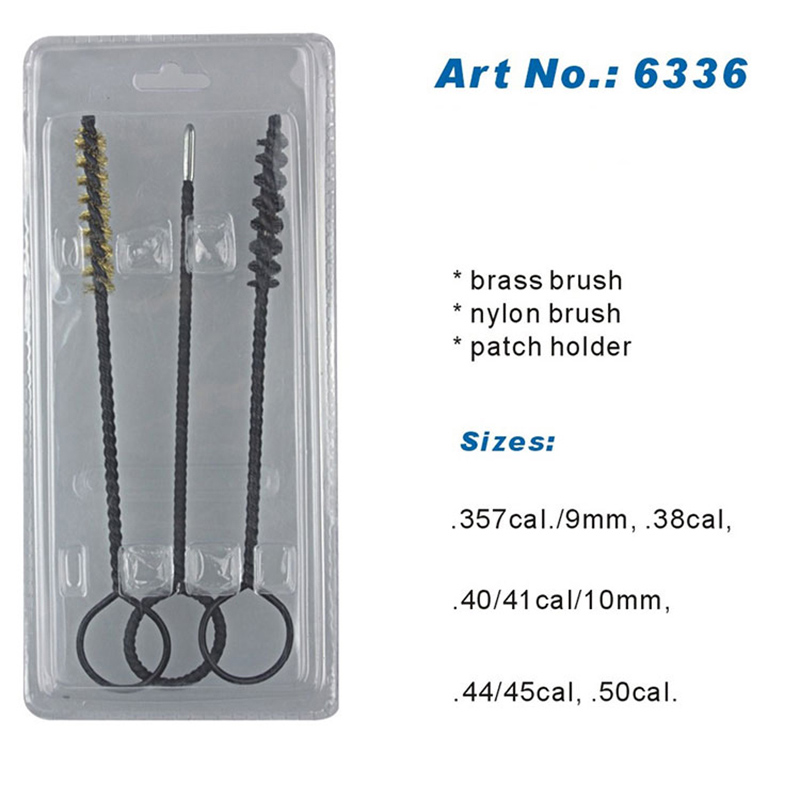 Set de 3 buc kit de curățare a pistolului, ambalat în blister dublu. O perie de curățare a găurii din alamă, o perie de curățare a găurii din nailon și un suport de plasture cu fante. La îndemână și eficientă.