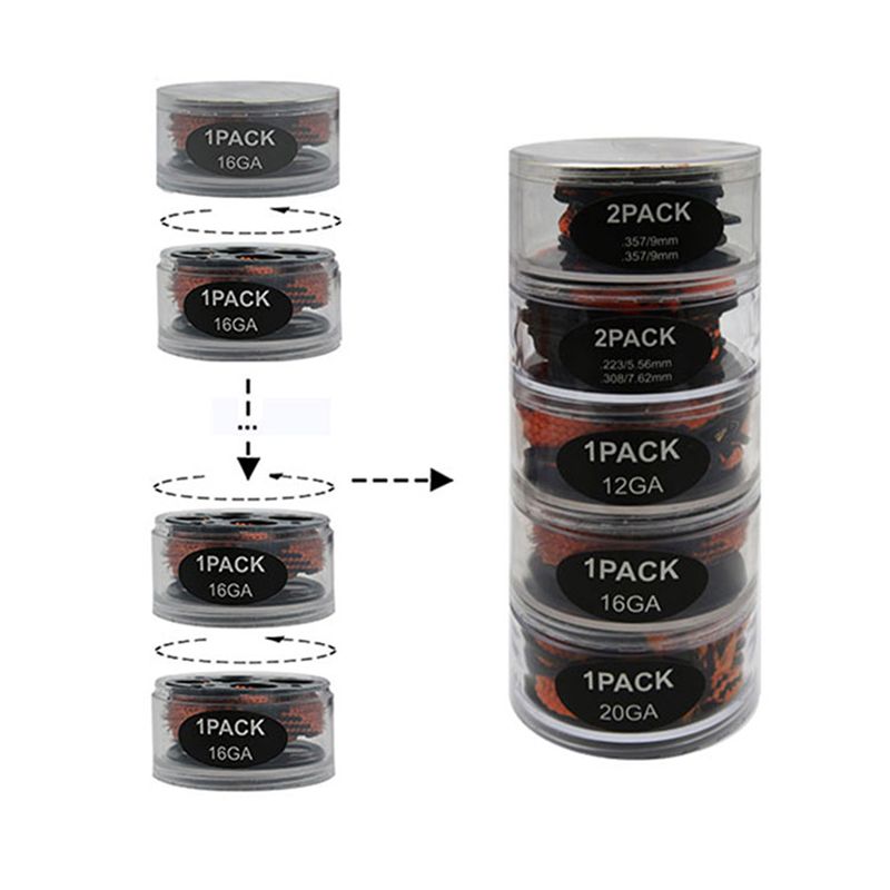 Pachet cu mai multe straturi de frânghie pentru curățarea pistolului.DIY.Combinație de calibre și cantități Combinație cu mai multe straturi, acest cilindru cu mai multe straturi este compus din mai multe frânghii de curățare a pistoalelor de șerpi, de diferite calibre. Este convenabil pentru depozitare și colectare. Miezul interior poate fi folosit nu numai ca miez de înfășurare a frânghiei, ci și ca mâner de tragere. Un astfel de pachet cilindric este mai ușor de găsit decât un singur pachet. Designul este brevetat de Rotchi.