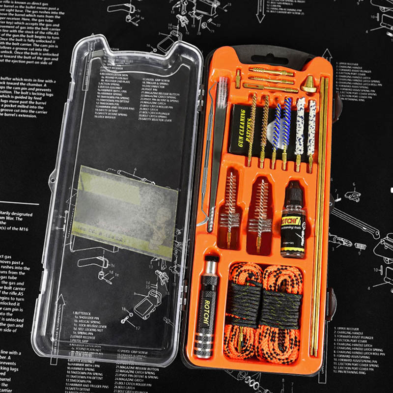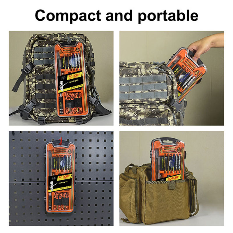 Setul de curățare a pistolului setul pușcă/pistol cu aer comprimat .223.177 cu frânghii alezajului vă oferă instrumentele complete de curățare profesionale pentru a face față diferitelor calibre ale armelor. Tăvile cu blistere vă ajută să le colectați în mod regulat. Volumul mic și carcasa puternică vă pot permite să le puneți în cutii de arme sau în saci.