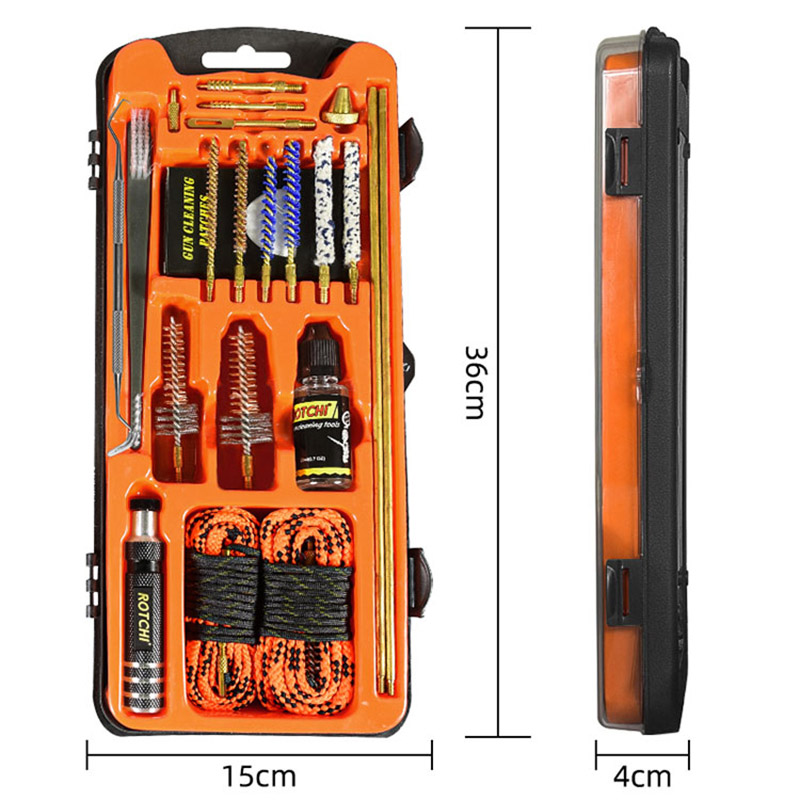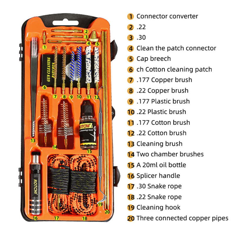 Setul de curățare a pistolului setul pușcă/pistol cu aer comprimat .223.177 cu frânghii alezajului vă oferă instrumentele complete de curățare profesionale pentru a face față diferitelor calibre ale armelor. Tăvile cu blistere vă ajută să le colectați în mod regulat. Volumul mic și carcasa puternică vă pot permite să le puneți în cutii de arme sau în saci. Seria este fără sticlă de ulei.