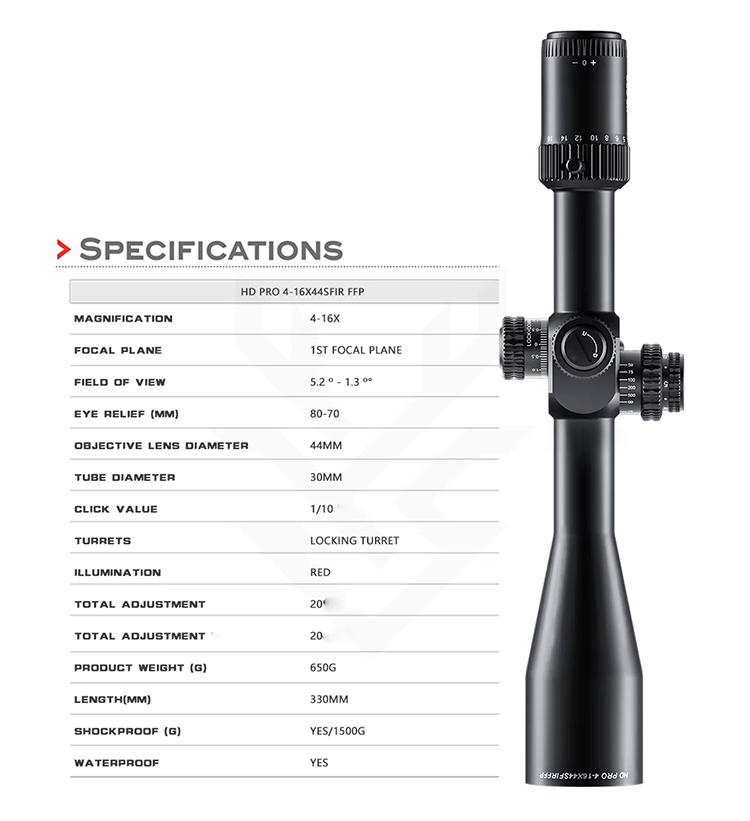 Optics HD PRO 4-16X44 SFIR FFP Rezistență ridicată la șocuri Lunetă de vânătoare Tactică Tragere cu rază lungă de acțiune Tub de 30 mm