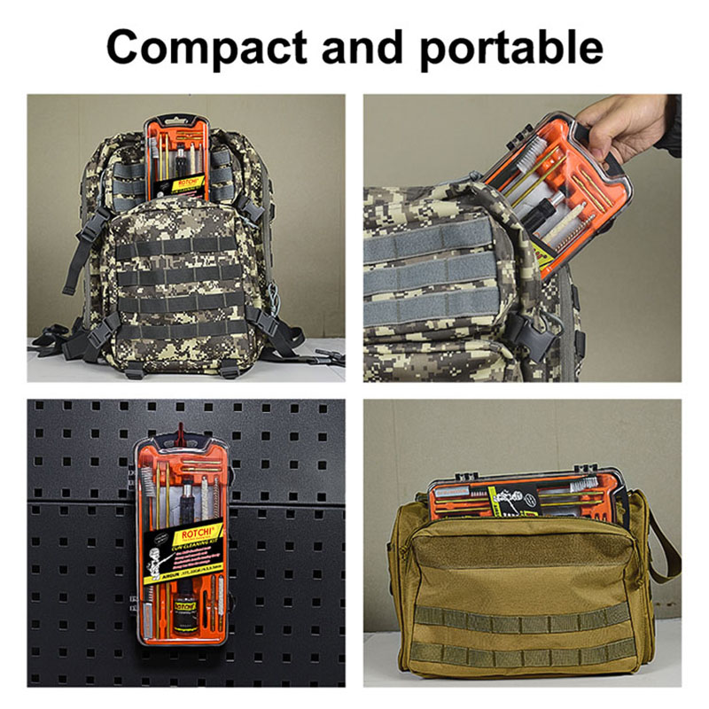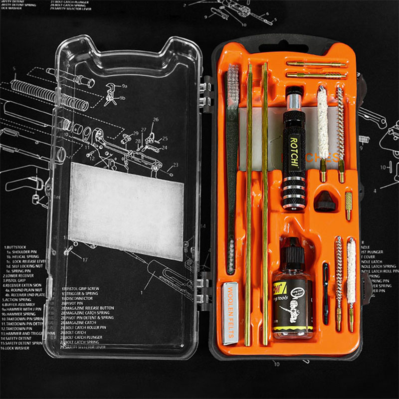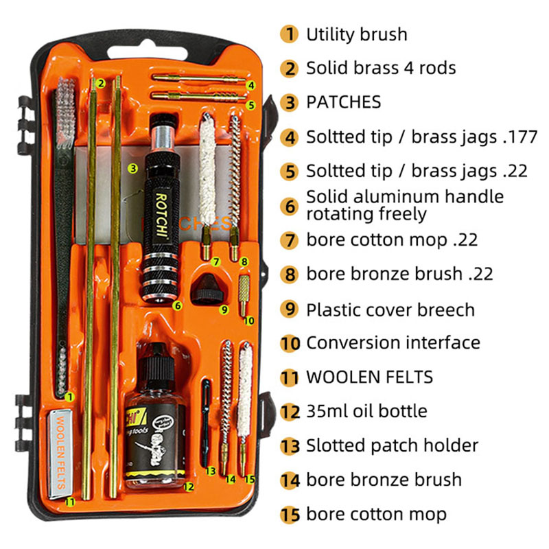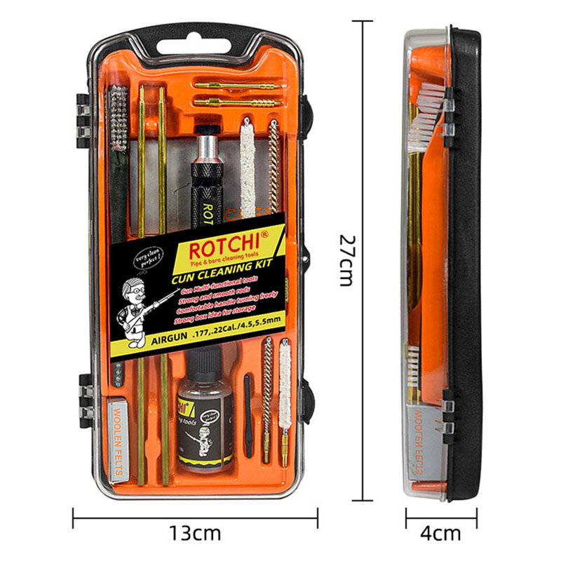 Setul de curățare a puștilor cu aer comprimat cu sticlă de ulei vă oferă instrumentele de curățare profesionale complete pentru a face față diferitelor calibre ale armelor. Tăvile cu blistere vă ajută să le colectați în mod regulat. Volumul mic și carcasa puternică vă pot permite să le puneți în cutii de arme sau în saci. Seria este fără sticlă de ulei.