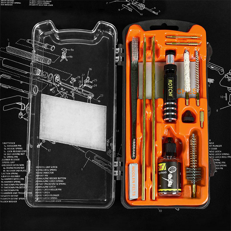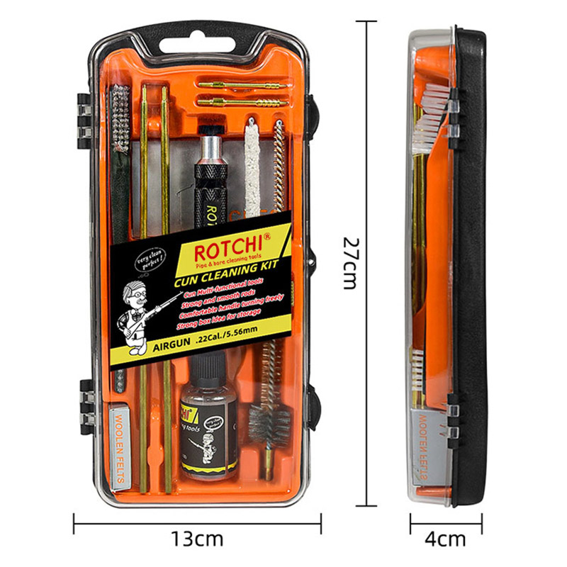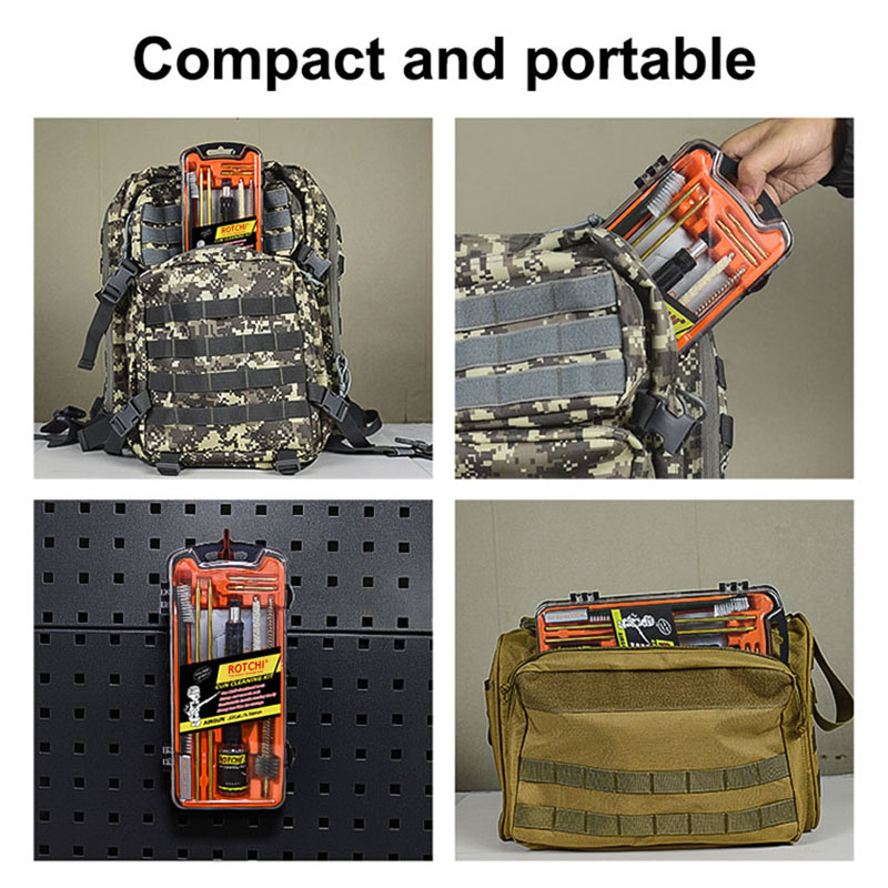 Setul de curățare a puștii sticla de ulei de carcasă portocalie vă oferă instrumentele complete de curățare profesionale pentru a face față diferitelor calibre ale armelor. Tăvile cu blistere vă ajută să le colectați în mod regulat. Volumul mic și carcasa puternică vă pot permite să le puneți în cutii de arme sau în saci. Seria este fără sticlă de ulei.